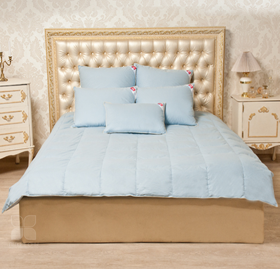 Одеяла выпускаются в двух вариантах цвета: небесно-голубой и теплый — шампань из пуходержащего тика, по периметру отделка шелковым кантом, оттеняющим его своим блеском.